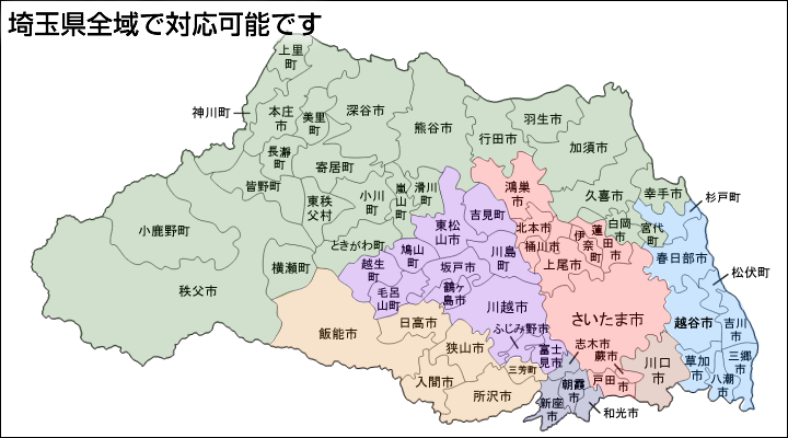 | 4 | 川越 | 川越市、富士見市、ふじみ野市、鶴ヶ島市、坂戸市、川島町、越生町、毛呂山町、鳩山町、東松山市、吉見町 |